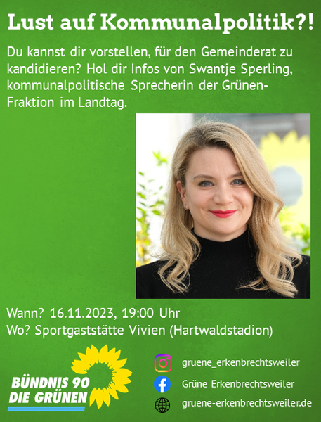 Am 09. Juni 2024 steht die Neuwahl des Gemeinderates an. Du möchtest dich aktiv an der Gestaltung unsere Ortes beteiligen? Themen wie Klimawandel, nachhaltige Entwicklung, regenerative Energieerzeugung, Umwelt- und Naturschutz und lebenswerte Kommune sind dir wichtig? Du bist jung und das ganze Leben liegt noch vor dir? Lasse nicht andere über deine Zukunft entscheiden sondern entscheide selbst! Bringe deine Ideen und Werte ein und gestalte den Ort aktiv mit!