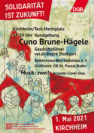 In Kirchheim wurde das bunte Programm aufgrund der aktuellen Corona-Lage reduziert. Der Markplatz der Ideen und die Demonstration wurden abgesagt. Die Kundgebung um 14:30 Uhr wird allerdings wie geplant stattfinden. Als Redner sind Cuno-Brune Hägele, der Geschäftsführer des ver.di-Bezirk Stuttgart, sowie Eylem Aslan-Bilir vom Volkshaus Kirchheim e. V. eingeladen. Musikalisch wird die Kundgebung umrahmt von der Band „Zwei!“, ein Acoustic-Cover-Duo.