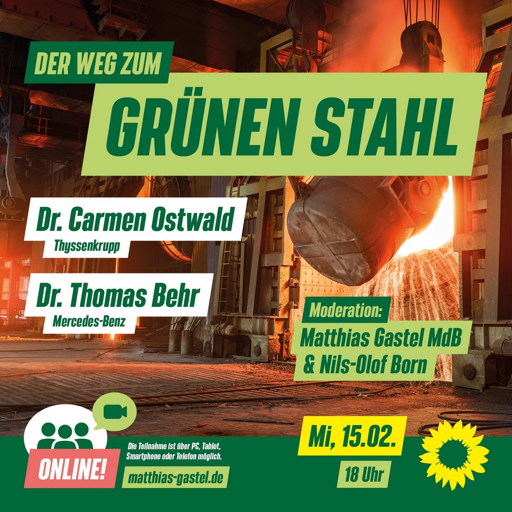 Wie können Stahl und Produkte mit Stahl künftig klimafreundlicher produziert werden? Was ist der aktuelle Stand der Technik und welche Ziele verfolgen die Industrien, die Stahl herstellen und weiter verarbeiten? Diesen Fragen gehen der grüne Bundestagsabgeordnete Matthias Gastel und Nils-Olof Born von der grünen Projektgruppe Industriepolitik auf den Grund. Rede und Antwort stehen dabei Dr. Carmen Ostwald, Head of Business Development bluemint® Steel und Dr. Thomas Behr, Leiter Rohbau-Engineering Mercedes-Benz.
