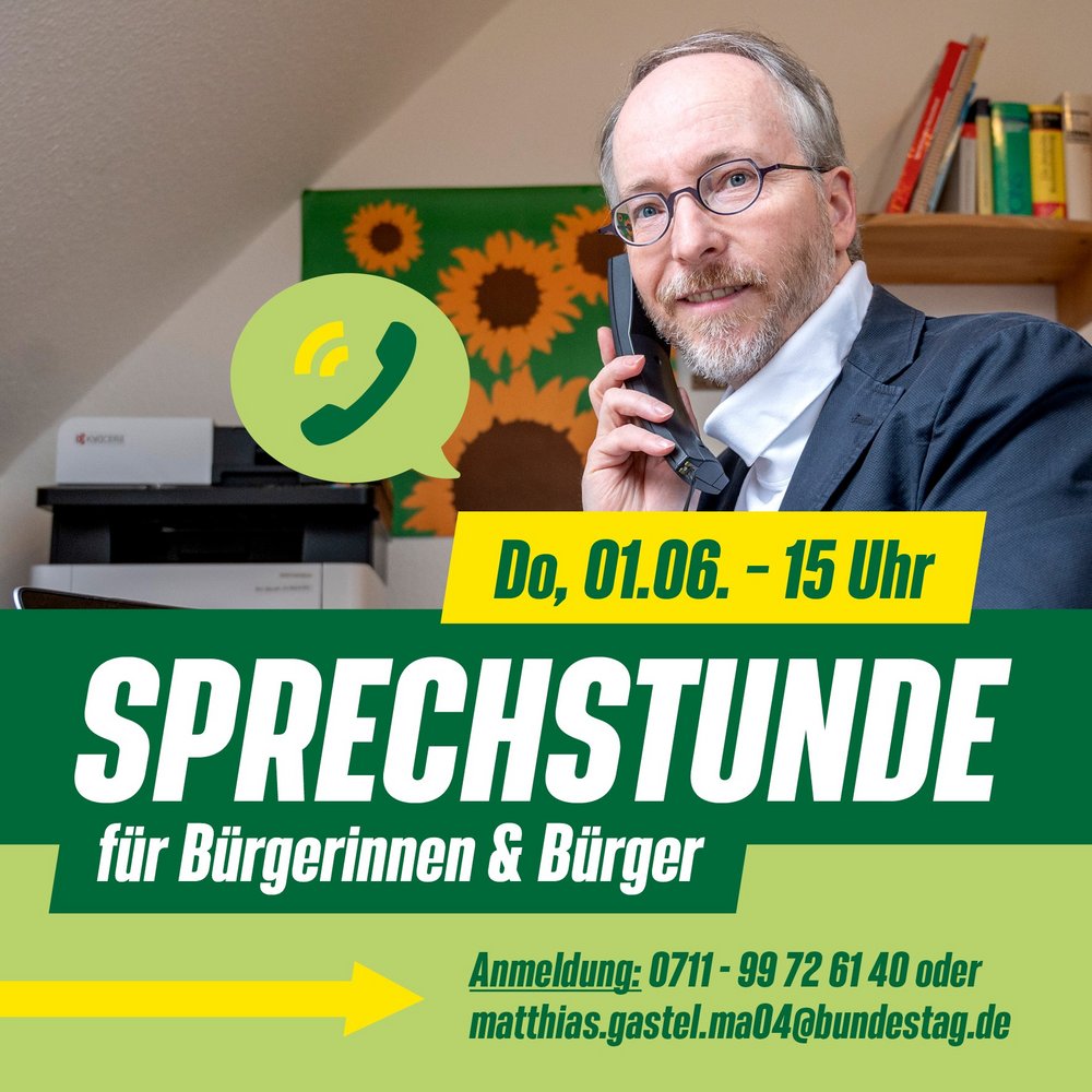 Eine vorherige Terminvereinbarung ist erforderlich per E-Mail an matthias.gastel.ma04@bundestag.de oder telefonisch unter der Nummer 0711/997 261 40.