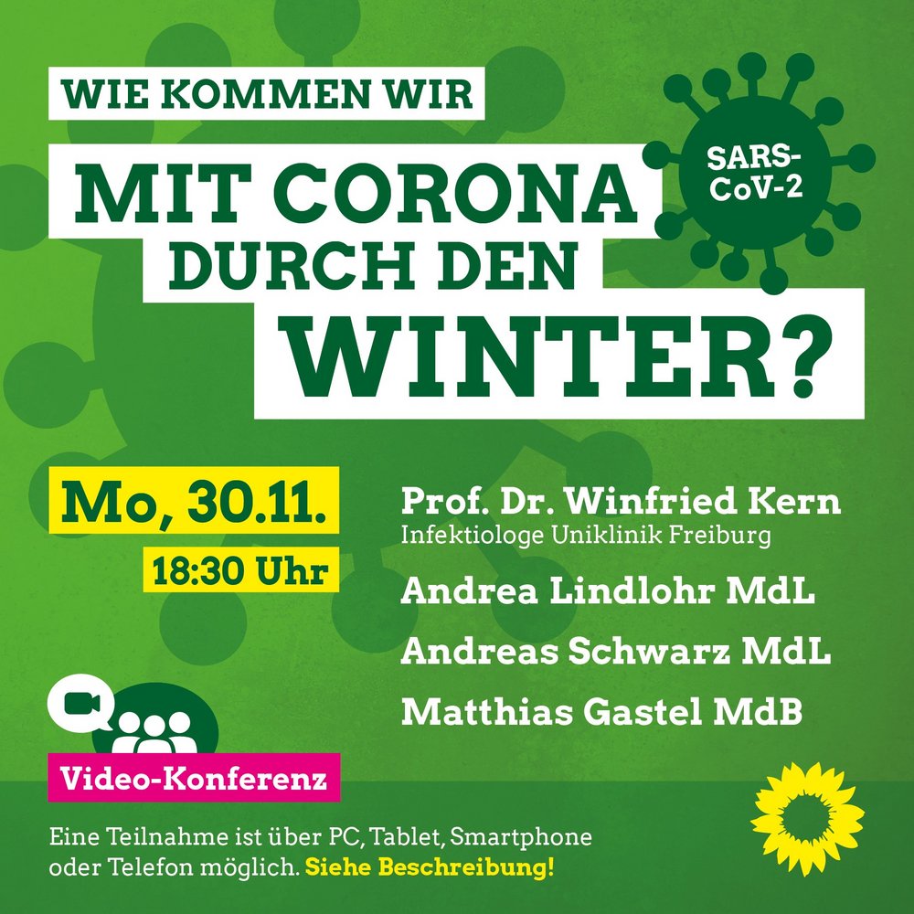 Videokonferenz am Montag, 30. November, ab 18:30 Uhr Corona-Winter – Zugang: gruenlink.de/1uqq Per Telefon: 0619-6781-9736 Optional: Kennnummer (Zugriffscode): 163 141 1362 Passwort: ProfKern (77635376 über Telefon- und Videosysteme)