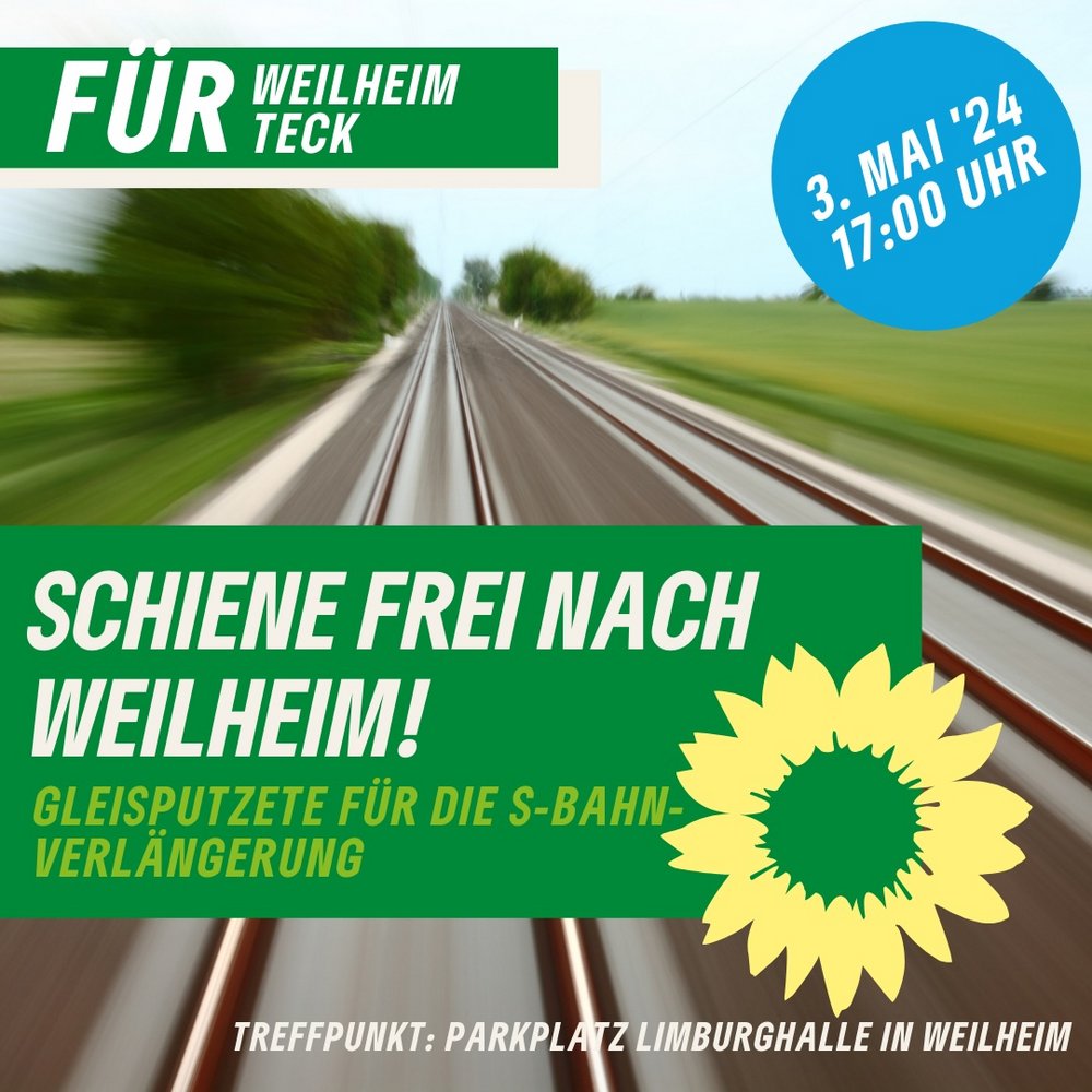 Wie der TECKBOTE am vergangenen Samstag berichtete, hält die Erweiterung der S1 bis Weilheim auch einer vertieften Untersuchung stand. Grund genug, der S-Bahn mit einer Gleisputzete den Weg frei zu machen: Die Kreistagskandidat:innen für den Wahlkreis Weilheim laden ein! Lernt sie kennen und diskutiert mit ihnen die Eisenbahnverlängerung.