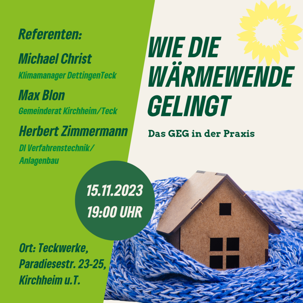 Am 15. November, 19:00 werden Michael Christ (Klimamanager aus Dettingen), Max Blon (Gemeinderat Kirchheim/Teck) und Herbert Zimmermann (Dipl.-Ing. für Verfahrenstechnik und Anlagenbau) mit Euch und allen Interessierten darüber diskutieren, wie die Wärmewende gelingen kann. Das Gebäudeenergiegesetz (GEG) liefert hierfür die Basis. Veranstaltungsort sind die Teckwerke, Paradiesstraße 23-25, 73230 Kirchheim unter Teck.